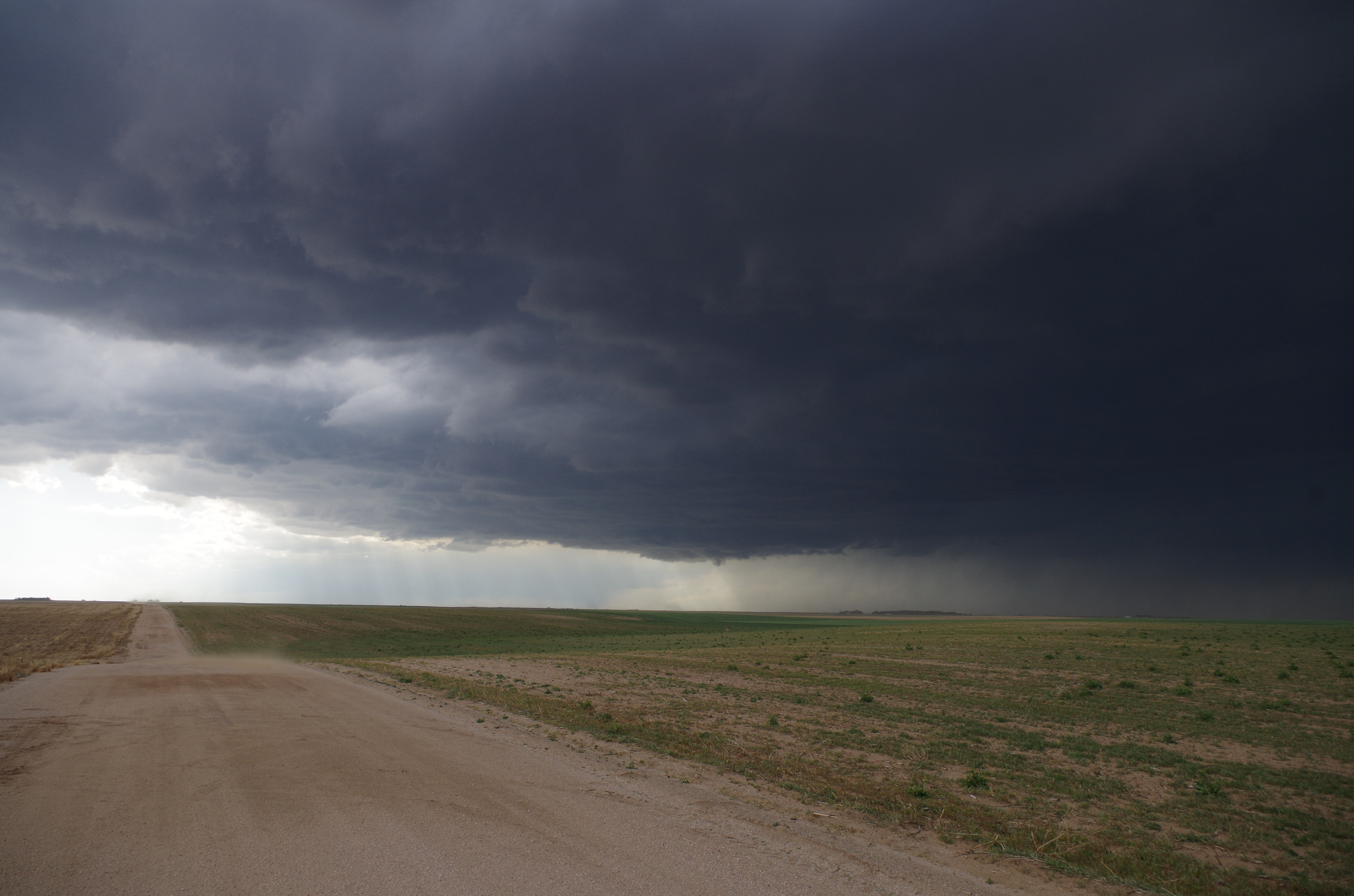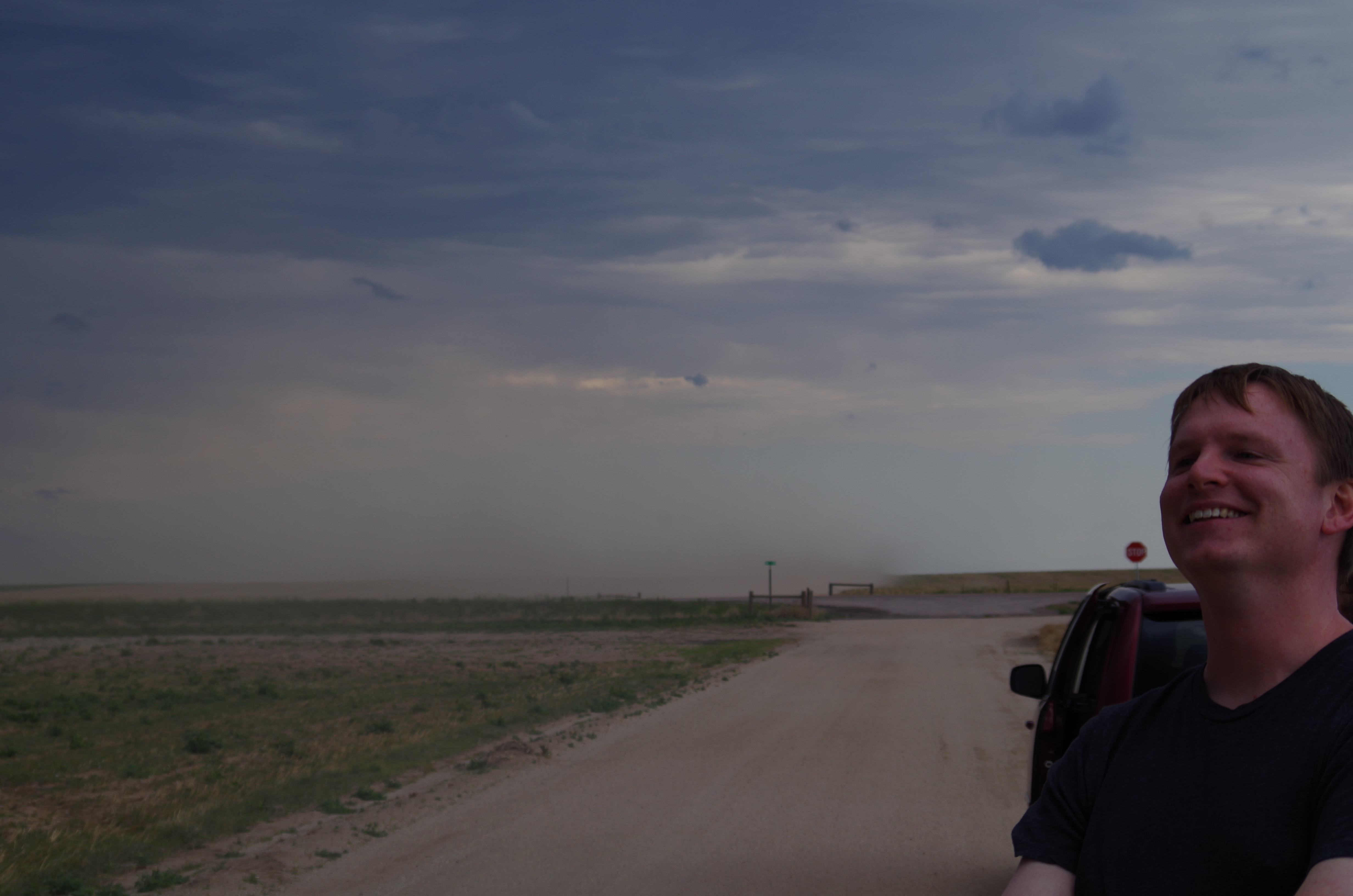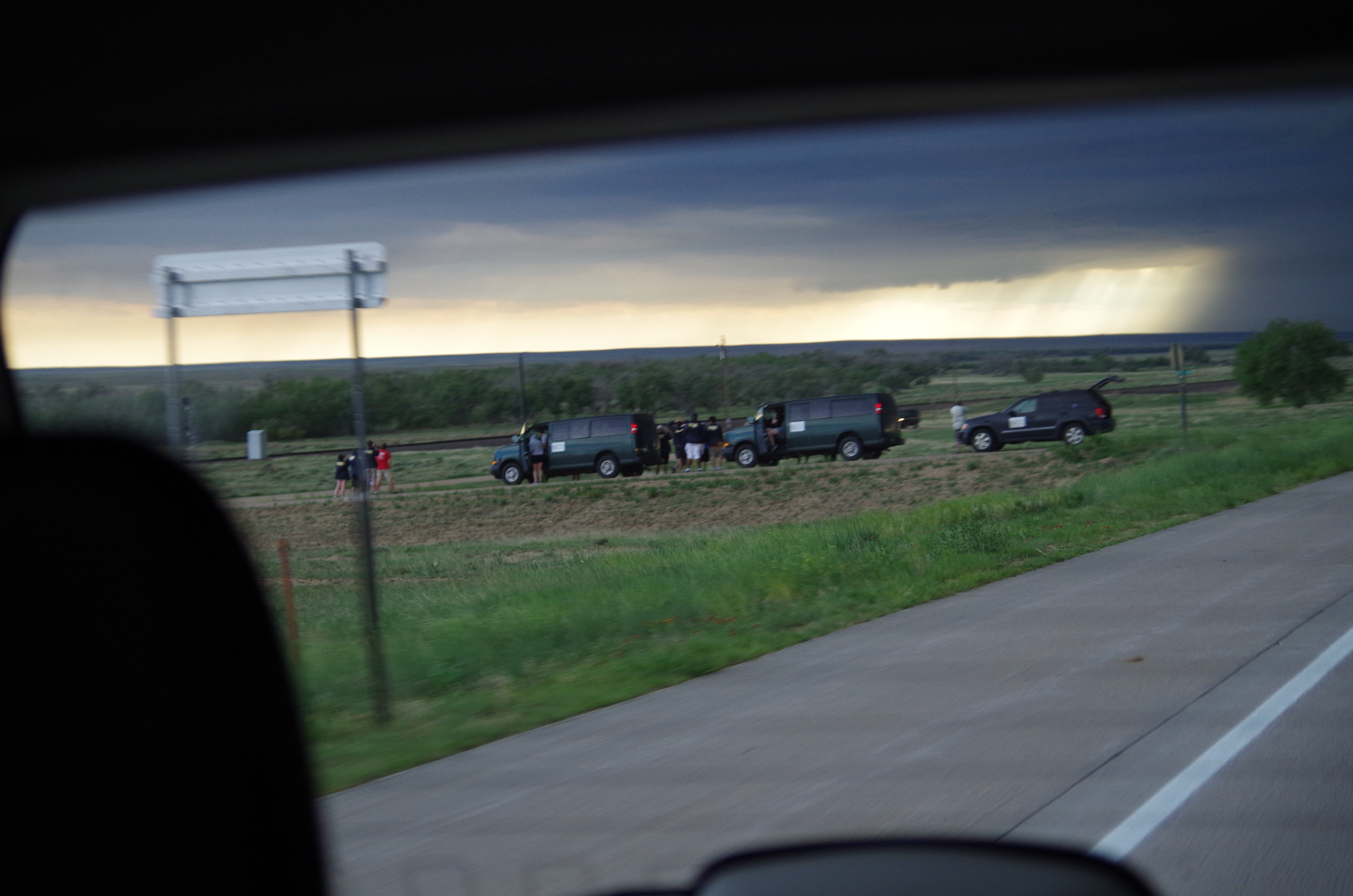 Arriving at Lamar, a thunderstorm had already developed and was headed right for the town. Topping off our tanks and emptying our bladders, we shot southward to dodge the storm. A few clicks behind us was actually Weather Channel Meteorologist Mark Elliot, another Rutgers Meteorology Alumnus, who was chasing with Mike Bettes. He too stopped nearby Limon and began pursuing the same cell we were. We kept in contact with him as best as we could throughout the day, trying to see if our paths could cross. Unfortunately, he did have to leave that cell later in the day for another cell closer to Denver, a move I’m sure that was done for better signal and population coverage. He did wish us a safe chase and expressed his jealousy as we chased the better cell.
