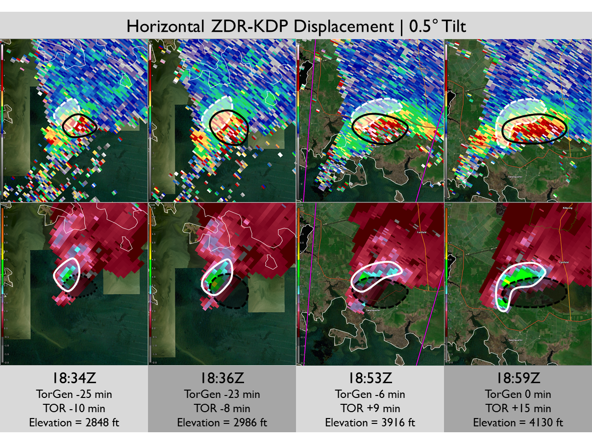 Additionally, ZDR-KDP value maxima show a horizontal displacement, which suggests the size sorting of hydrometeors from increased directional shear due to mesocyclone development, up to 10 minutes before the tornado warning was issued and up to 25 minutes before the tornado was confirmed (Fig. 2).